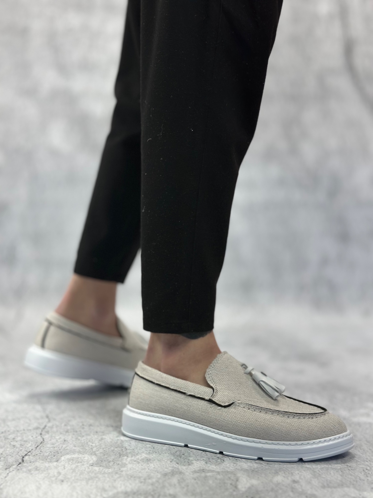BA0005 Bağcıksız Yüksek Taban Klasik Keten Beyaz Püsküllü Erkek Ayakkabı