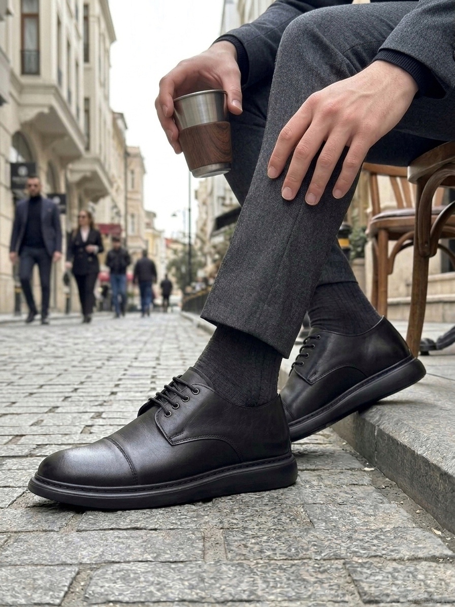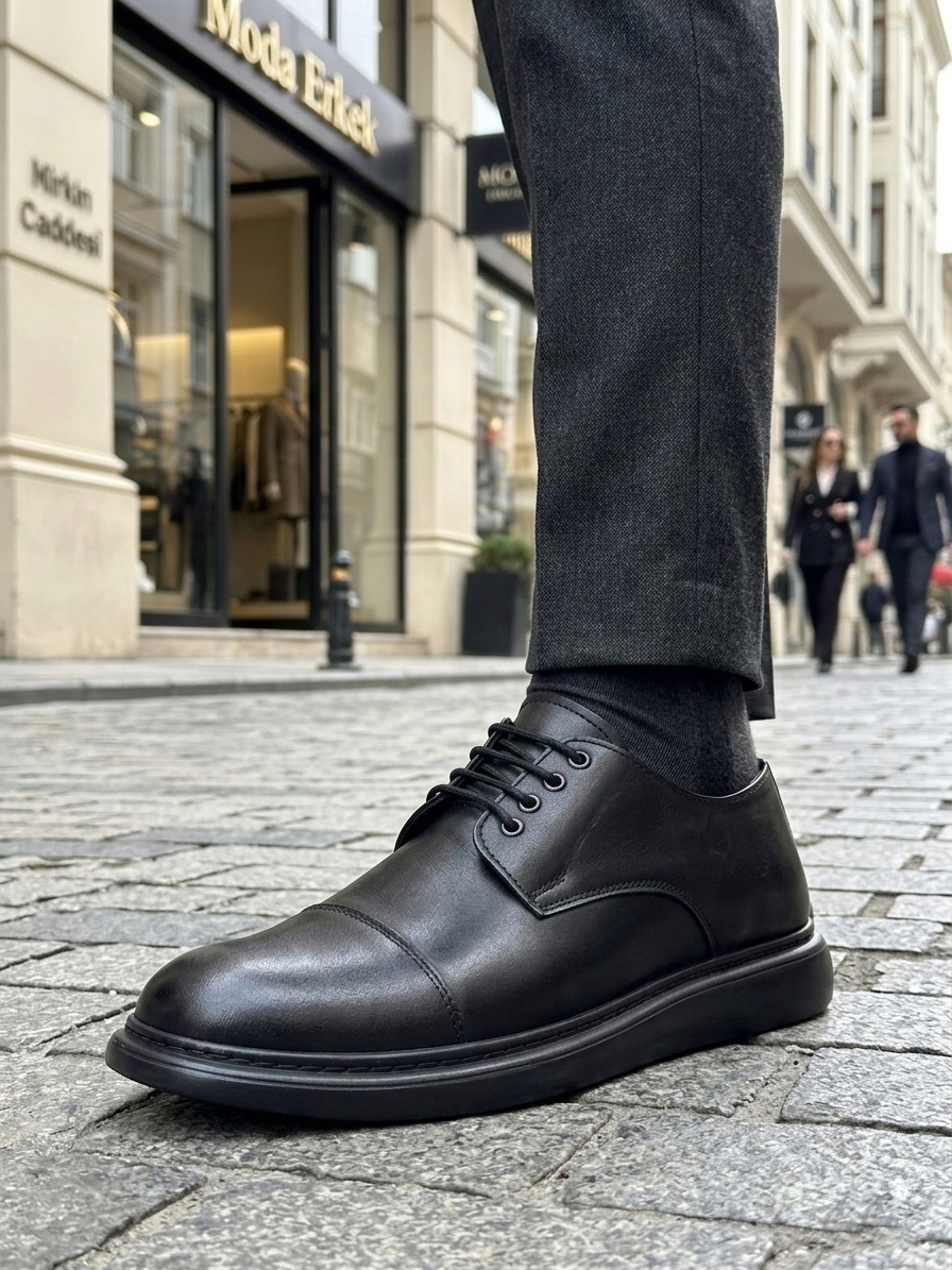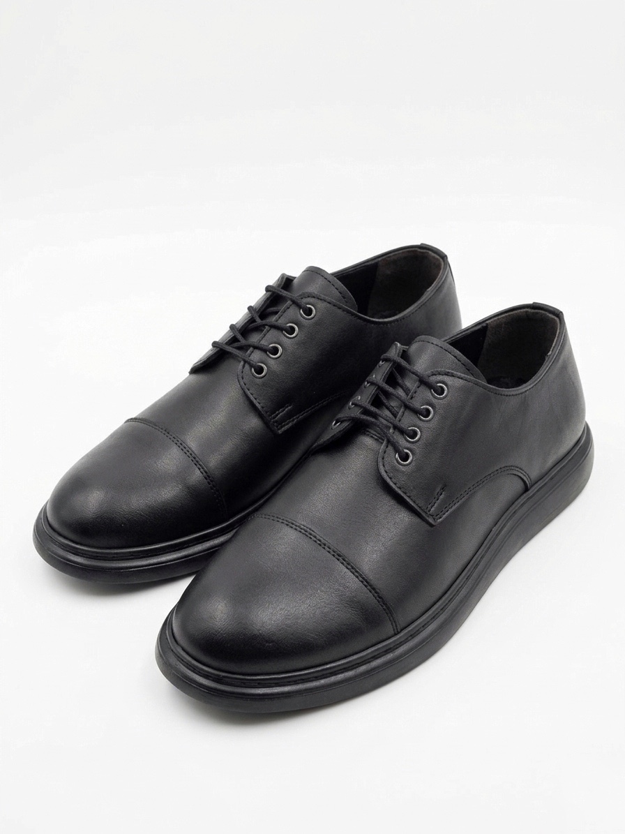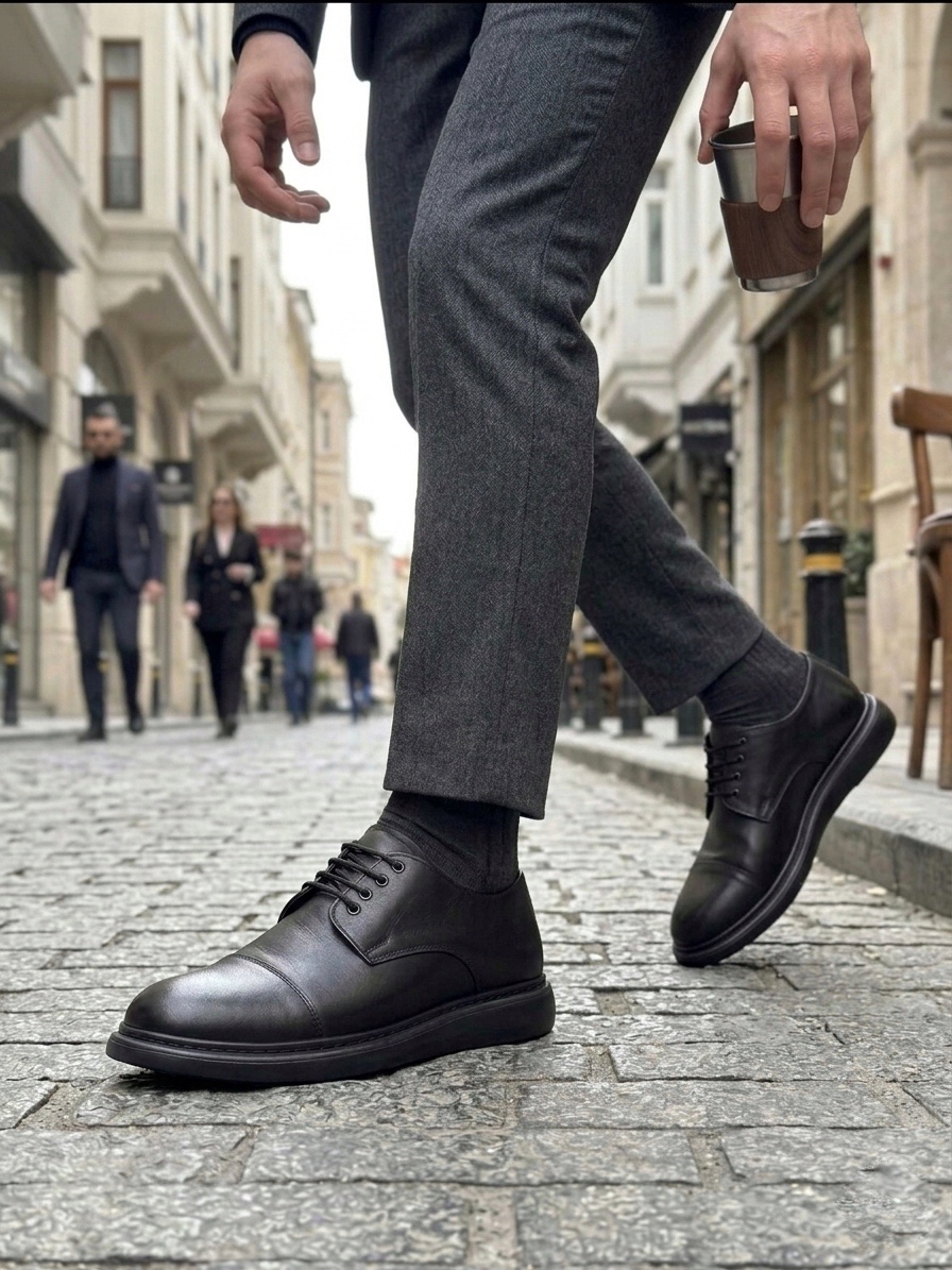 BA0003 Siyah Kapaklı Burun Bağcıklı Erkek Oxford Ayakkabı