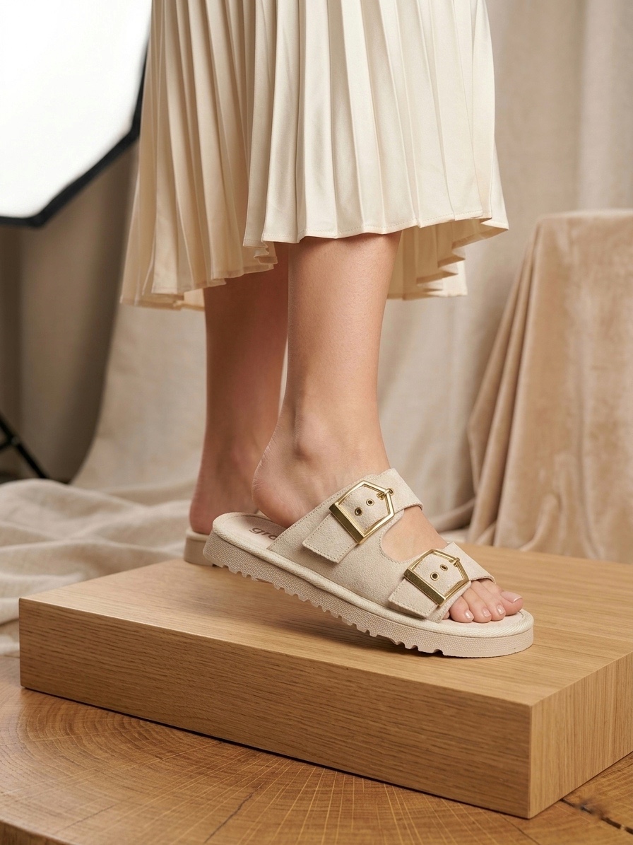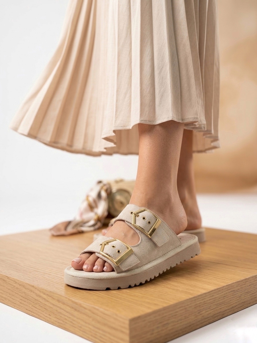 Yazlık Kadın Bej İnce Taban Tokalı Terlik