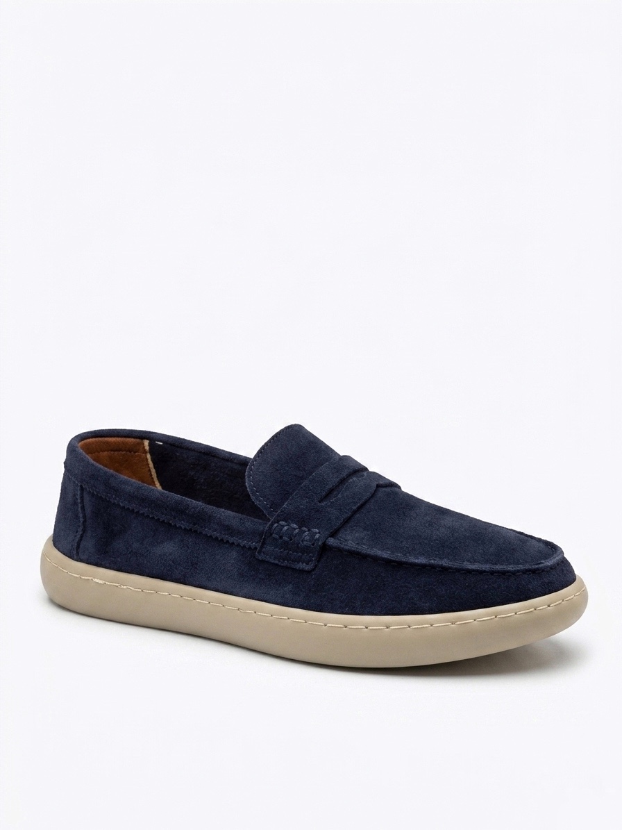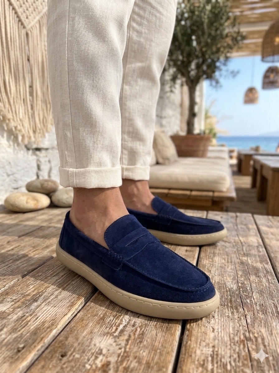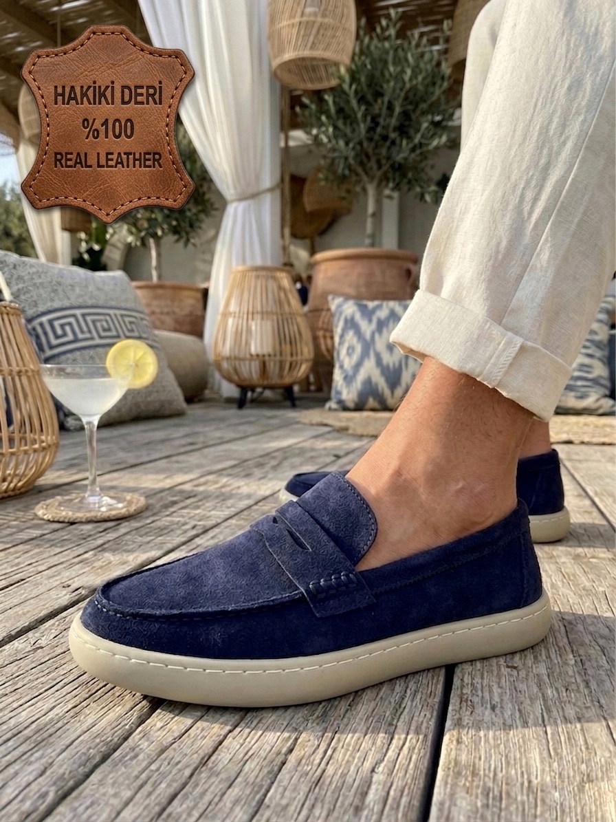 BA0251 %100 İçi Dışı Hakiki Deri Erkek Lacivert Süet Casual Loafer Kauçuk Rahat Taban Dikişli Ayakkabı