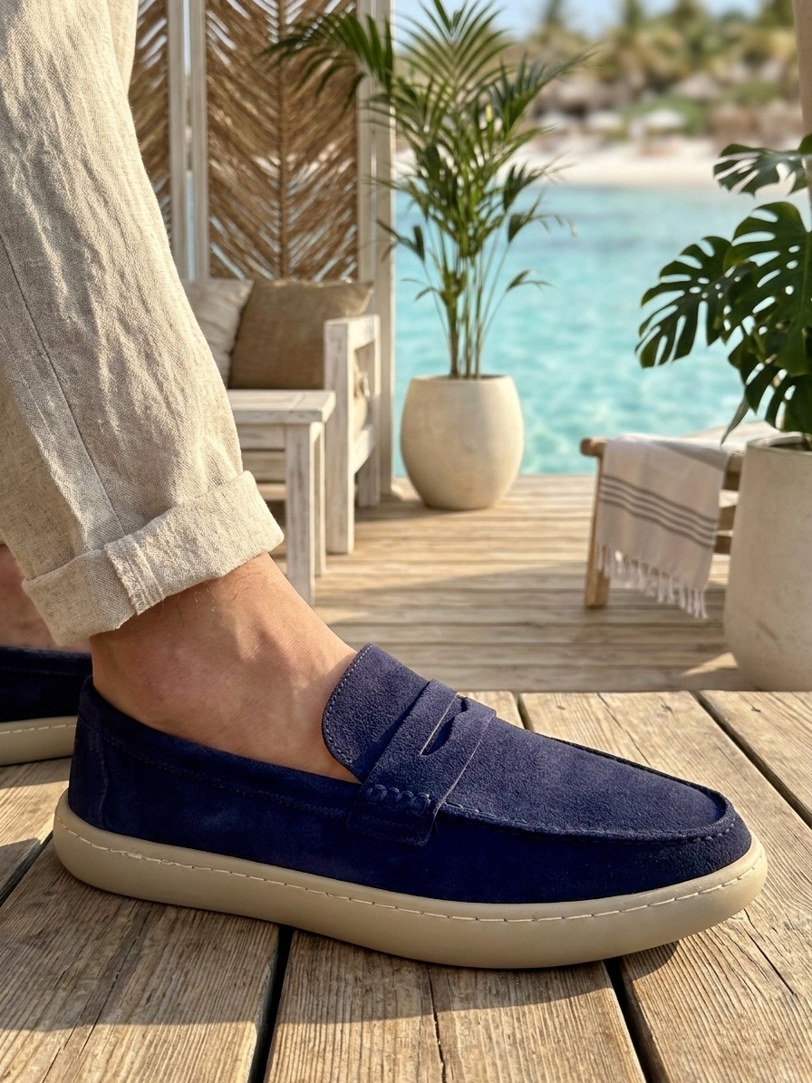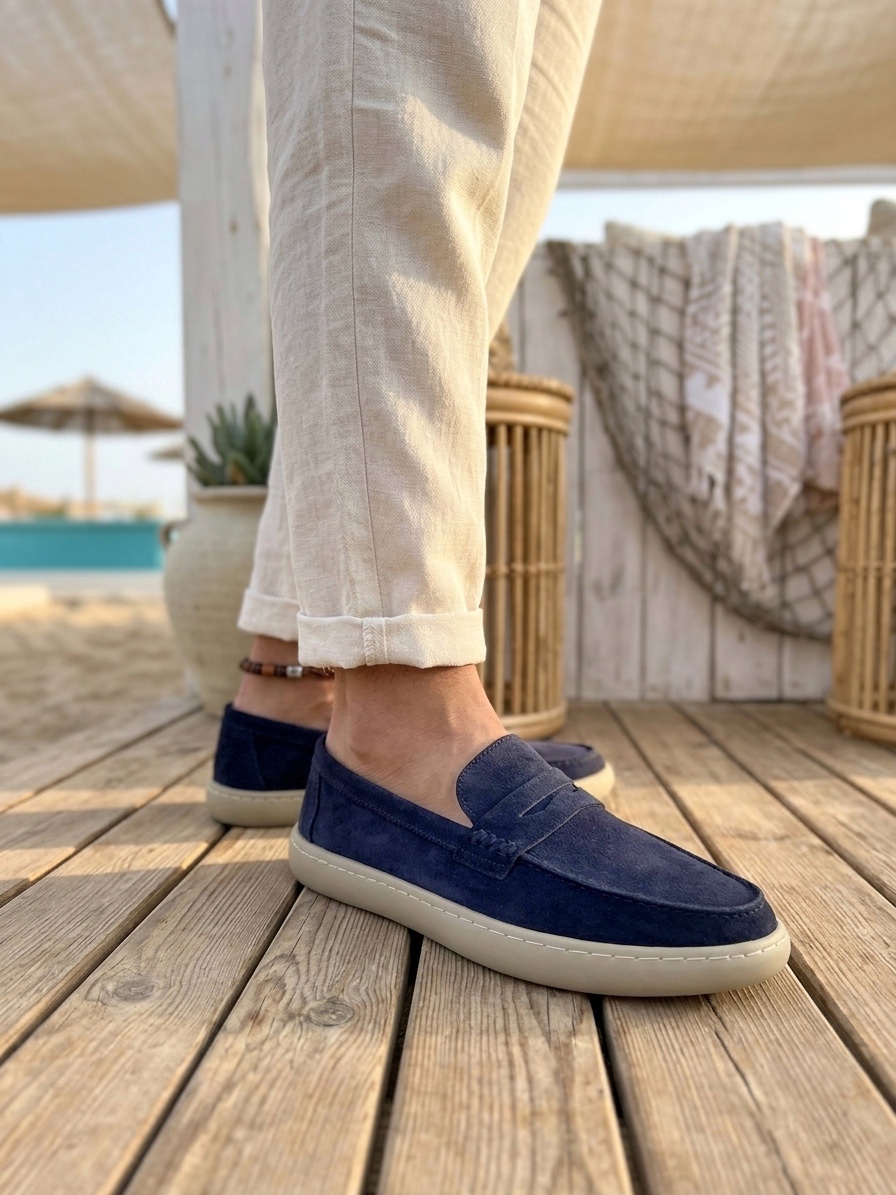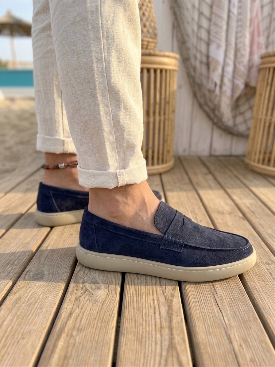BA0251 %100 İçi Dışı Hakiki Deri Erkek Lacivert Süet Casual Loafer Kauçuk Rahat Taban Dikişli Ayakkabı