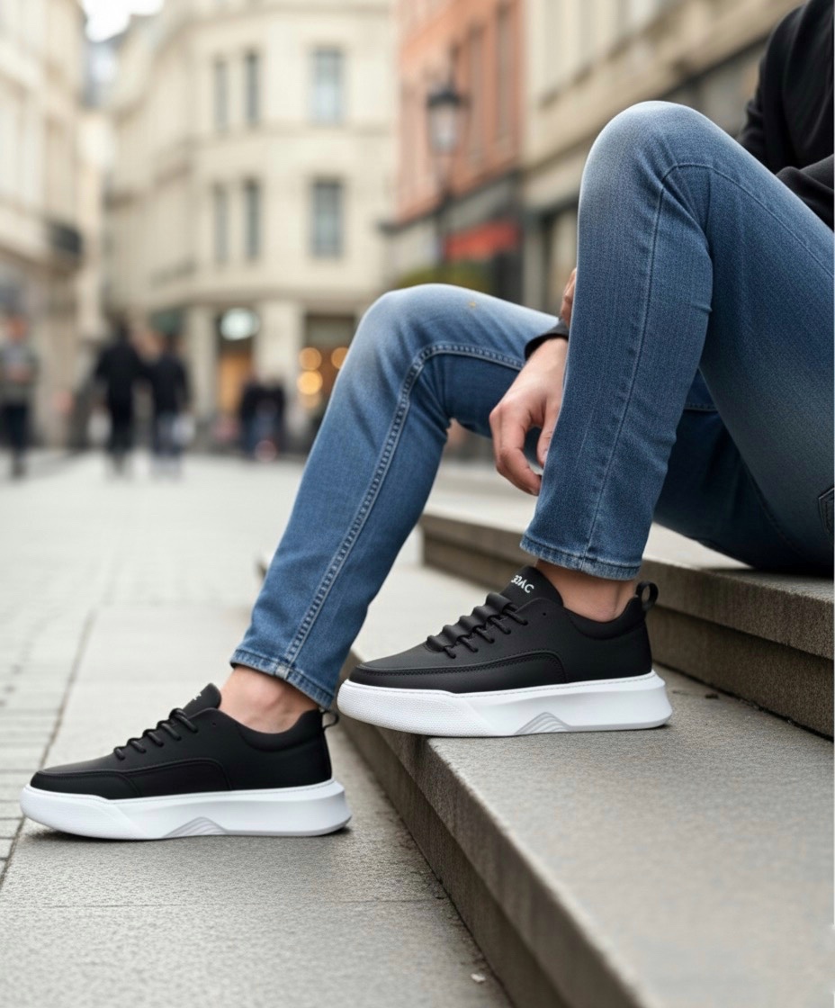 BA0332 Merdiven Desen Bağcıklı Erkek Yüksek Taban Siyah Cilt Beyaz Taban Spor Ayakkabı