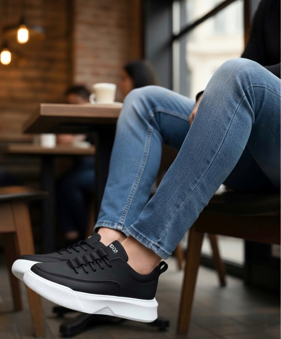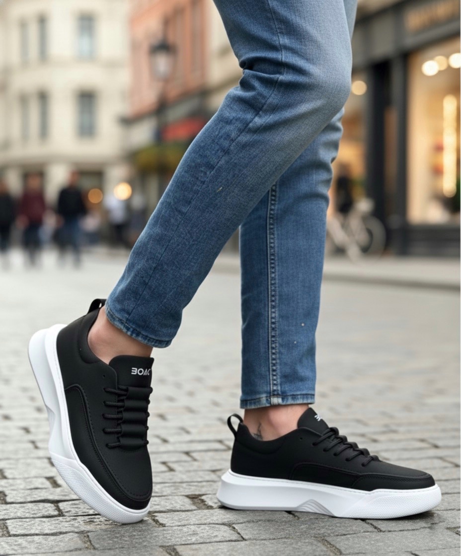 Spor BA0332 Merdiven Desen Bağcıklı Erkek Yüksek Taban Siyah Cilt Beyaz Taban Spor Ayakkabı