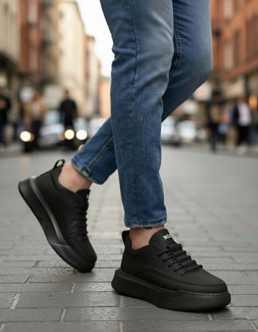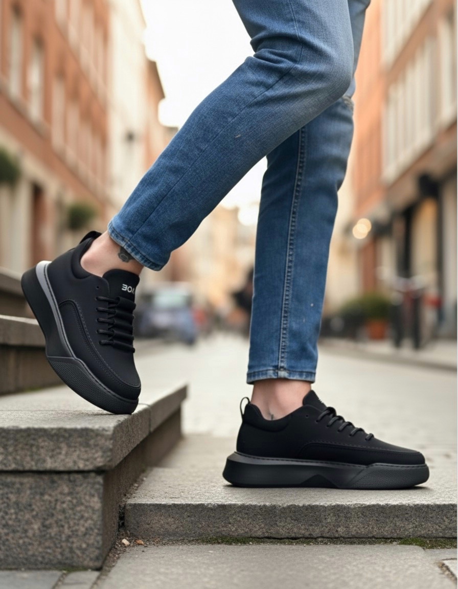BA0332 Merdiven Desen Bağcıklı Erkek Yüksek Taban Siyah Cilt Siyah Taban Spor Ayakkabı